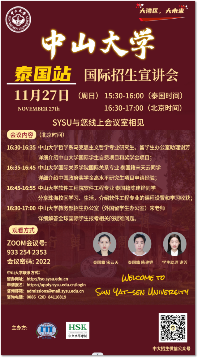 直播预告 | 中山大学2023年国际招生宣讲会(泰国站 2022年11月27日)